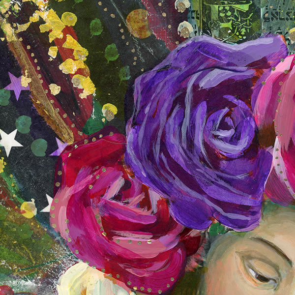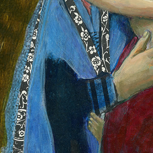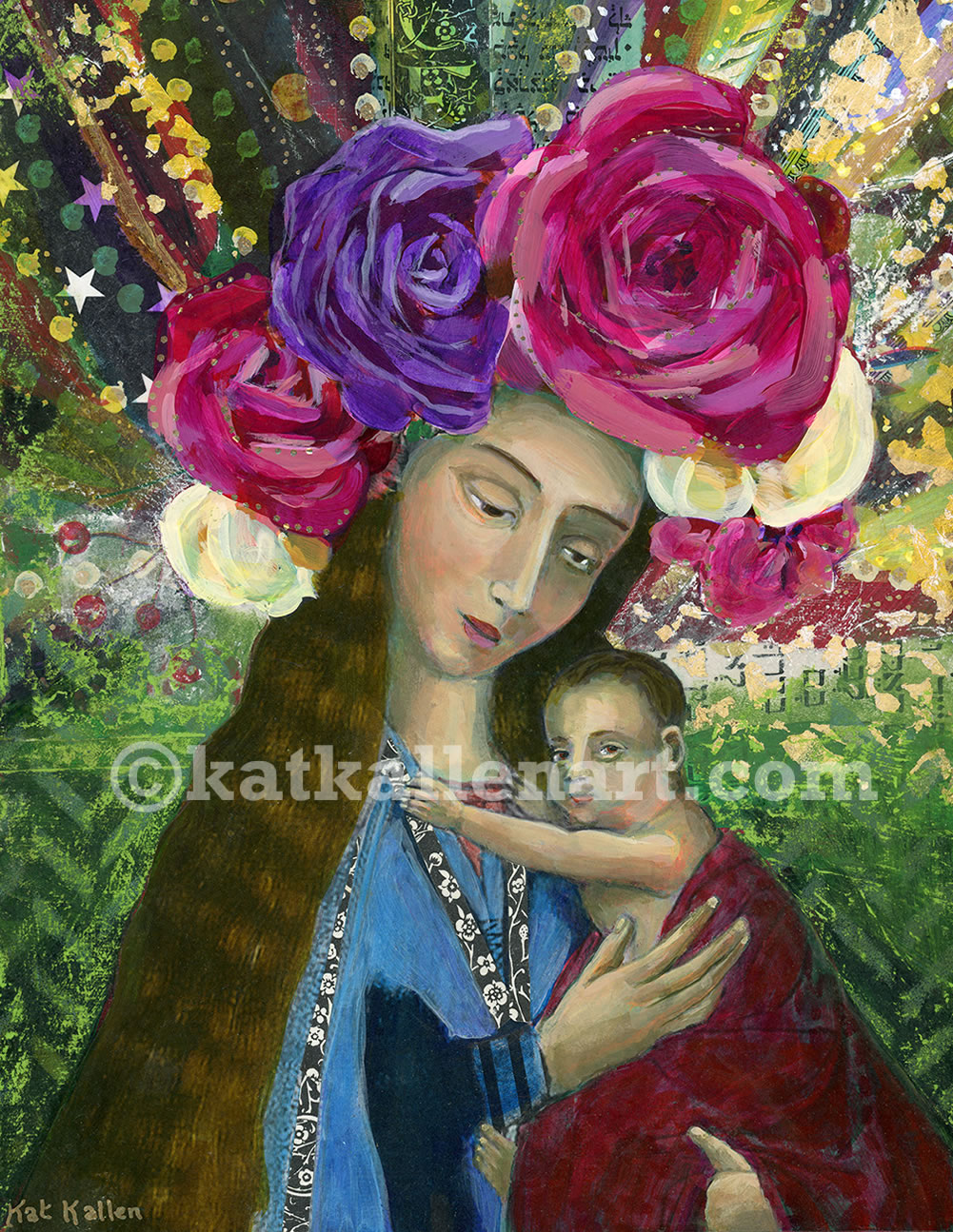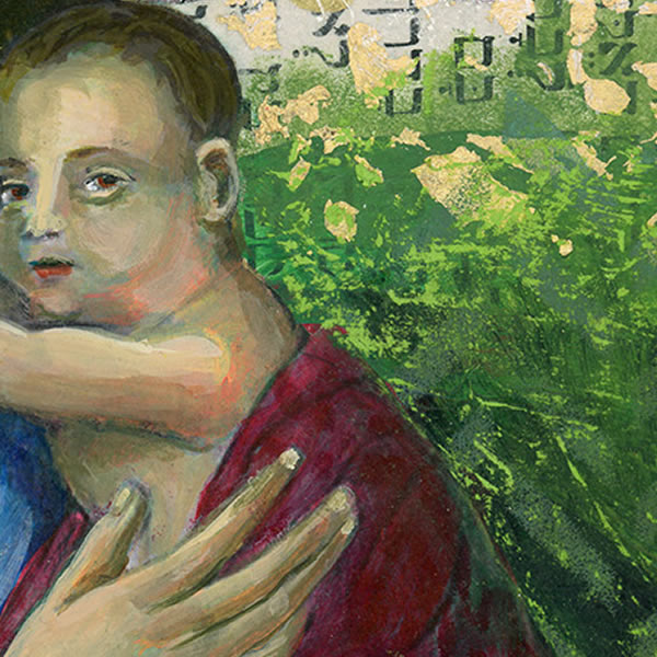 Contemporary style mixed media painting of Mary and Jesus. Acrylic paint, ink and collaged papers on birch wood cradled panel and finished with a UV protective varnish. Ready to hang. Panel size 8 x 10 in.