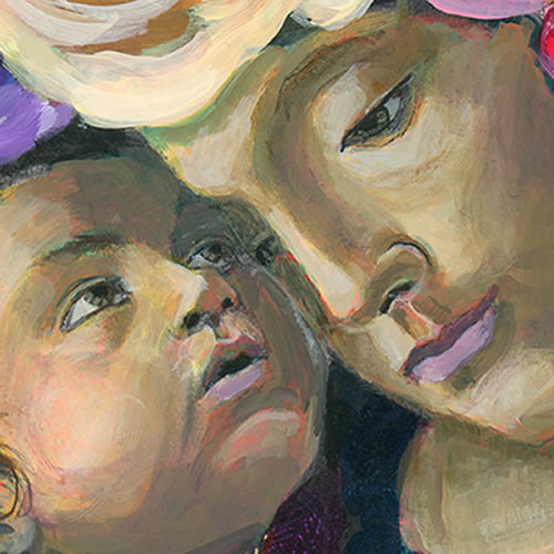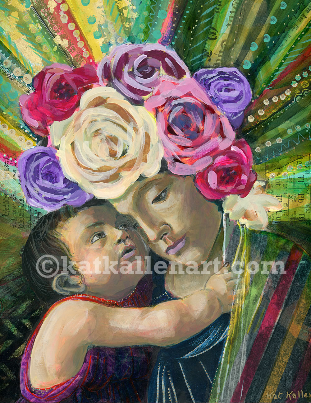 Contemporary style mixed media painting of Mary and Jesus. Acrylic paint, ink and collaged papers on birch wood cradled panel and finished with a UV protective varnish. Ready to hang. Panel size 9 x 12 in.